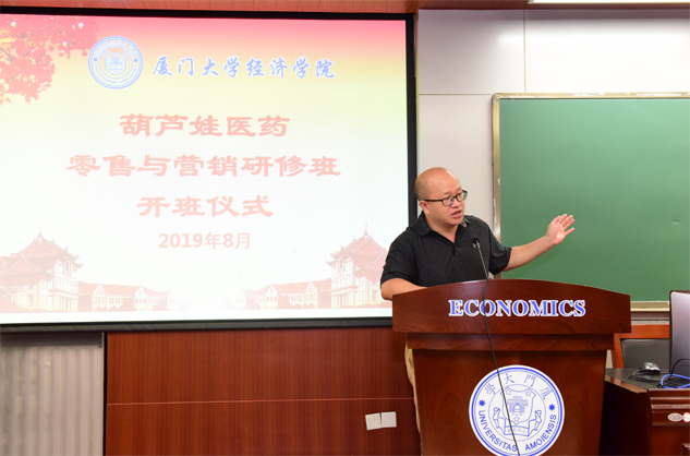在开班仪式上,廖景峰主任首先代表厦门大学经济学院热烈欢迎PT视讯医药零售与营销研修班的学员到厦大学习,并就厦门大学及经济学院的相关情况进行了介绍。他说,PT视讯学员走进厦大就是厦大的校友,希望未来的日子能够关心、支持母校的发展,多提宝贵意见,同时他也祝大家在厦大学习期间学有所成、学有所获。